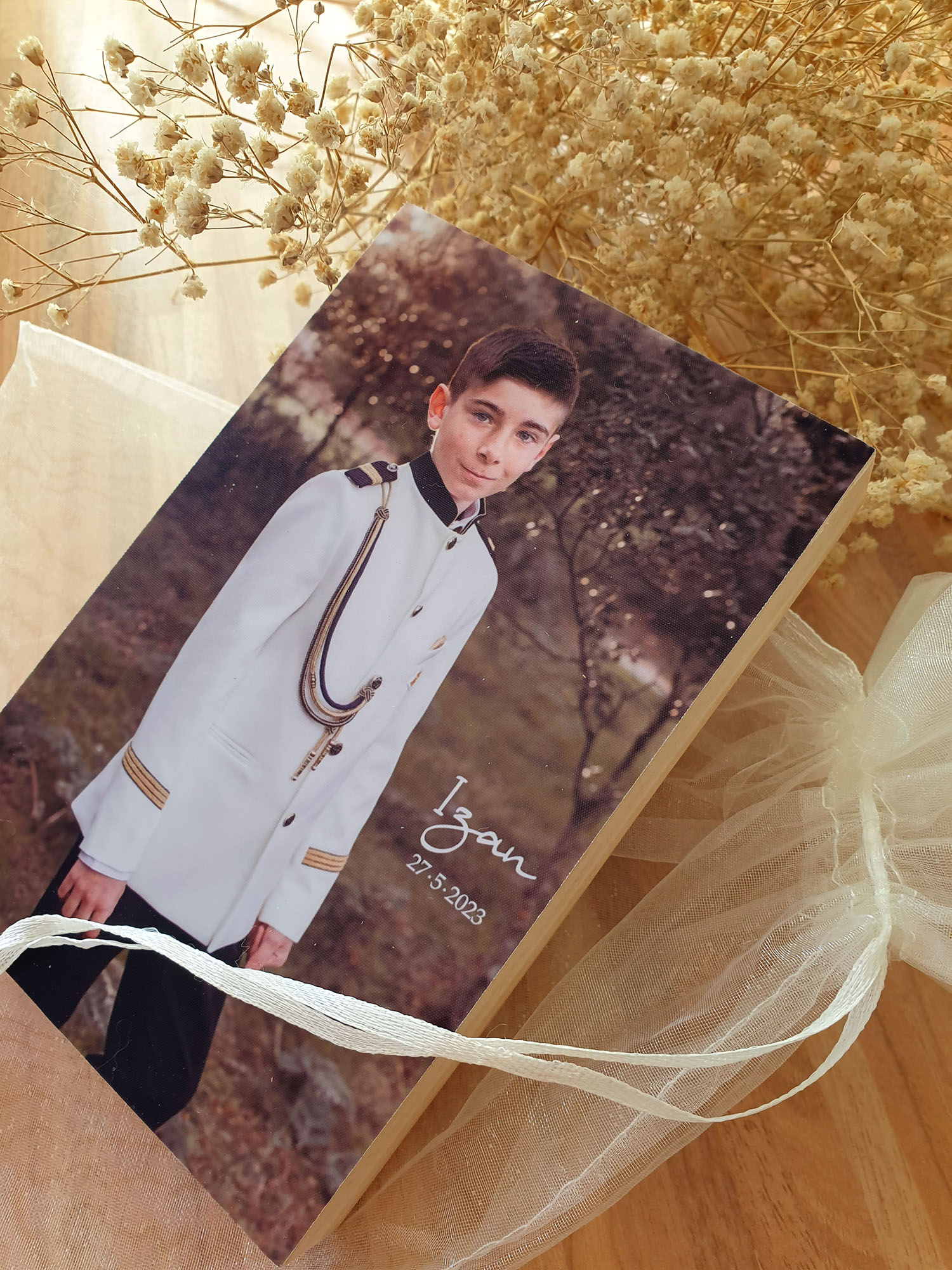 Original taco de madera maciza de pino con la impresión de la fotografía. Un toque rústico donde destacar la fotografía. El detalle de la bolsita de arganza viene incluida. Además podrás personalizar con el nombre y la fecha del niño.